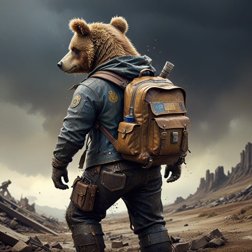 A close-up image of a bear dressed as a hero with a backpack, tattered clothes, and messy hair, set against a dark and grunge background. The artwork has a whimsical, glossy style with steampunk elements.