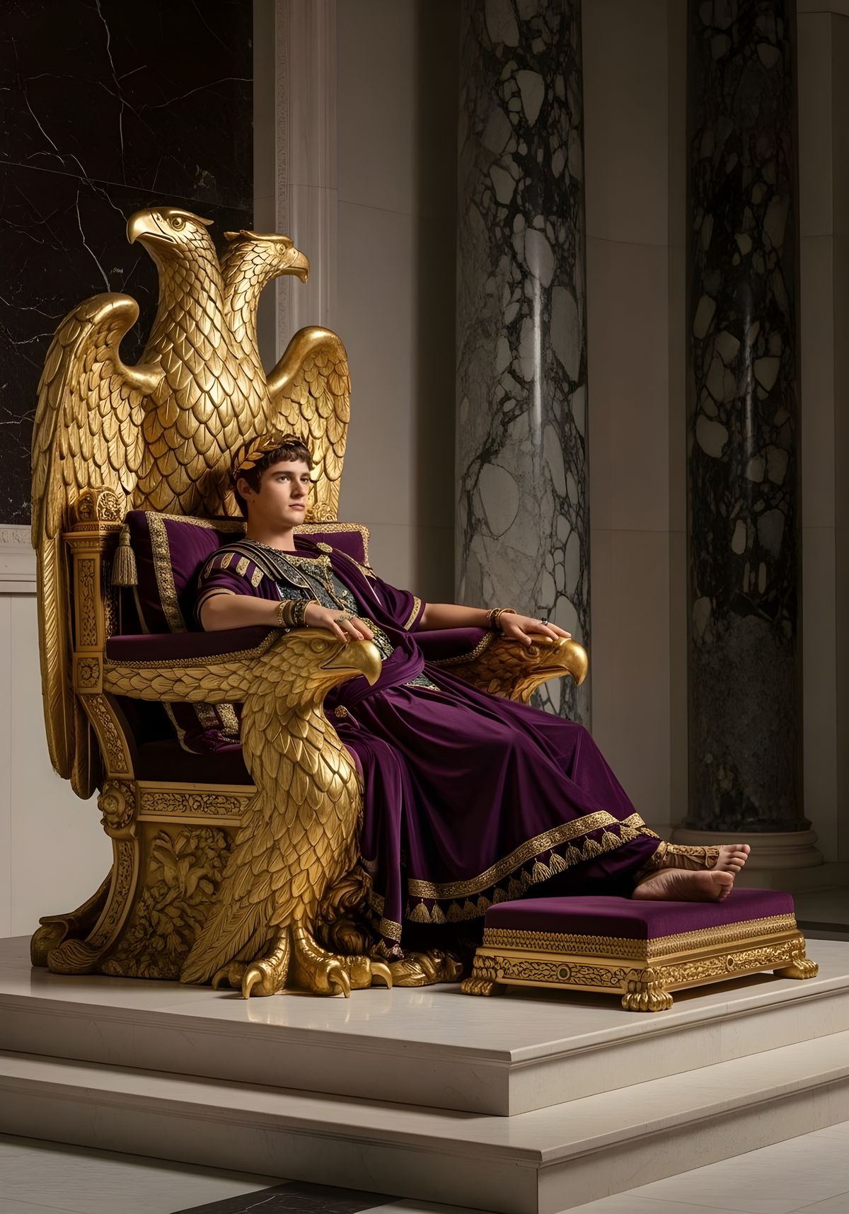 This image shows Emperor Nero lounging on an emerald-encrusted eagle throne in his palace. He wears a purple and gold toga, wreath crown, rings, and bracelets. The photograph is highly detailed with perfect lighting and 8K resolution.