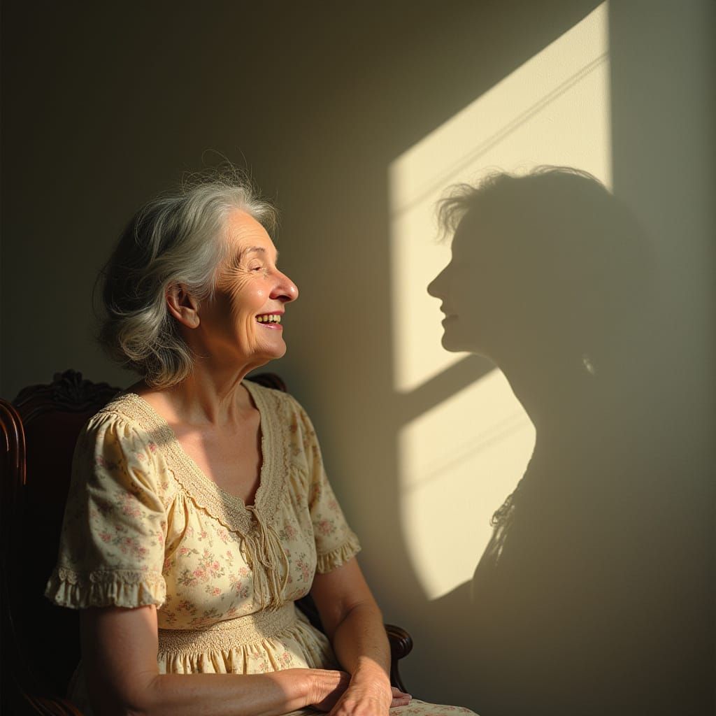 This poignant image captures an elderly woman lost in thought, gazing at the shadow of her youthful self, surrounded by warm sunlight and serene atmosphere, reminiscent of Waterhouse's ethereal style and Klimt's delicate textures.