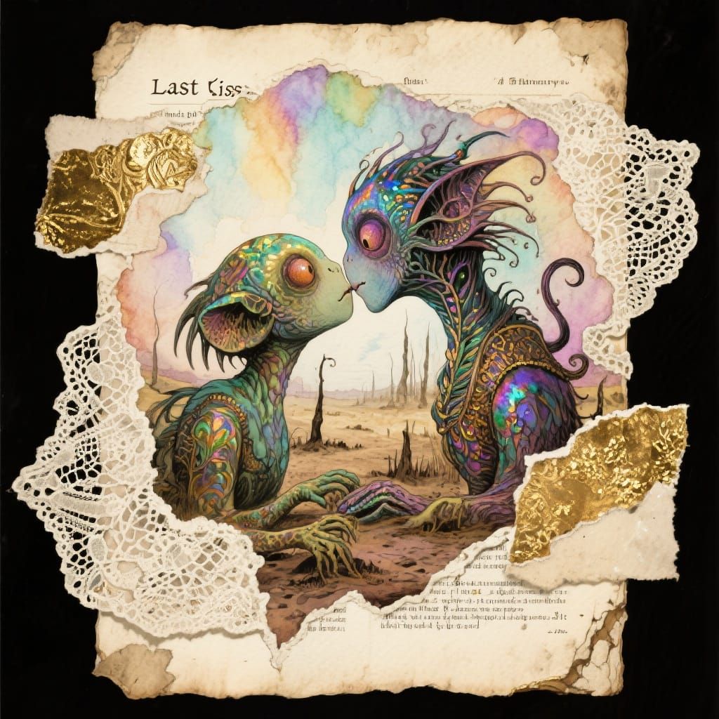 This image shows a surreal and mysterious scene of weird creatures in love in a desolate land. The artwork features vintage aesthetics, vibrant colors, and intricate details in a watercolor style, reminiscent of 18th-century literature illustrations.