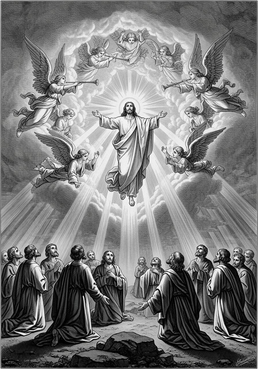 This image shows the ascension of Jesus into heaven. Celestial beings, clouds, and light surround Jesus as the disciples kneel in awe. The engraving features intricate line work and dramatic light, reminiscent of historical religious illustrations.