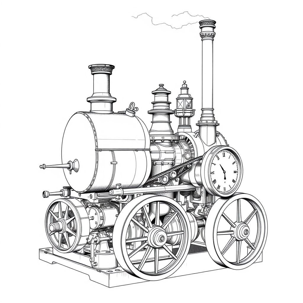 This technical illustration showcases a vintage steam engine in precise black and white, with intricate sketches highlighting copper Boiler, pistons, and valve gear, arranged in geometric patterns, evoking a steampunk aesthetic with a blend of science fiction and industrial heritage.