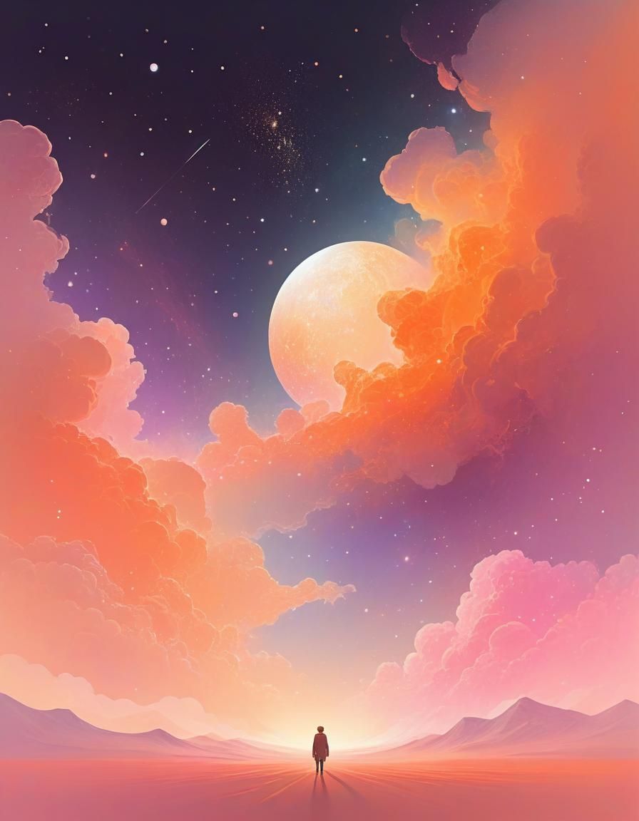 This artwork captures the beauty of the universe with soft, hazy orange and pink tones. The ethereal digital illustration evokes wonder and a polished, iridescent quality.