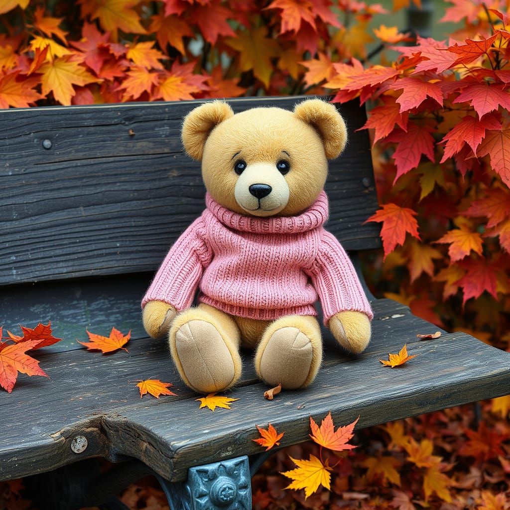 A charming image of a teddy bear sitting on a weathered bench amidst colorful fall leaves. The scene evokes a storybook illustration with a touch of fantastical realism.