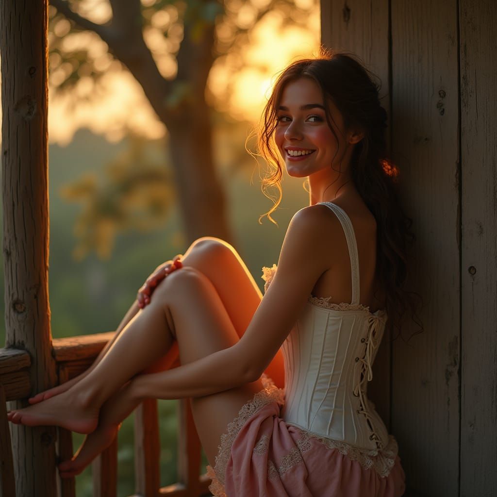 This image shows a woman on a balcony during golden hour. She's wearing a white corset and stockings, rendered with delicate brushstrokes in a romantic, whimsical style.