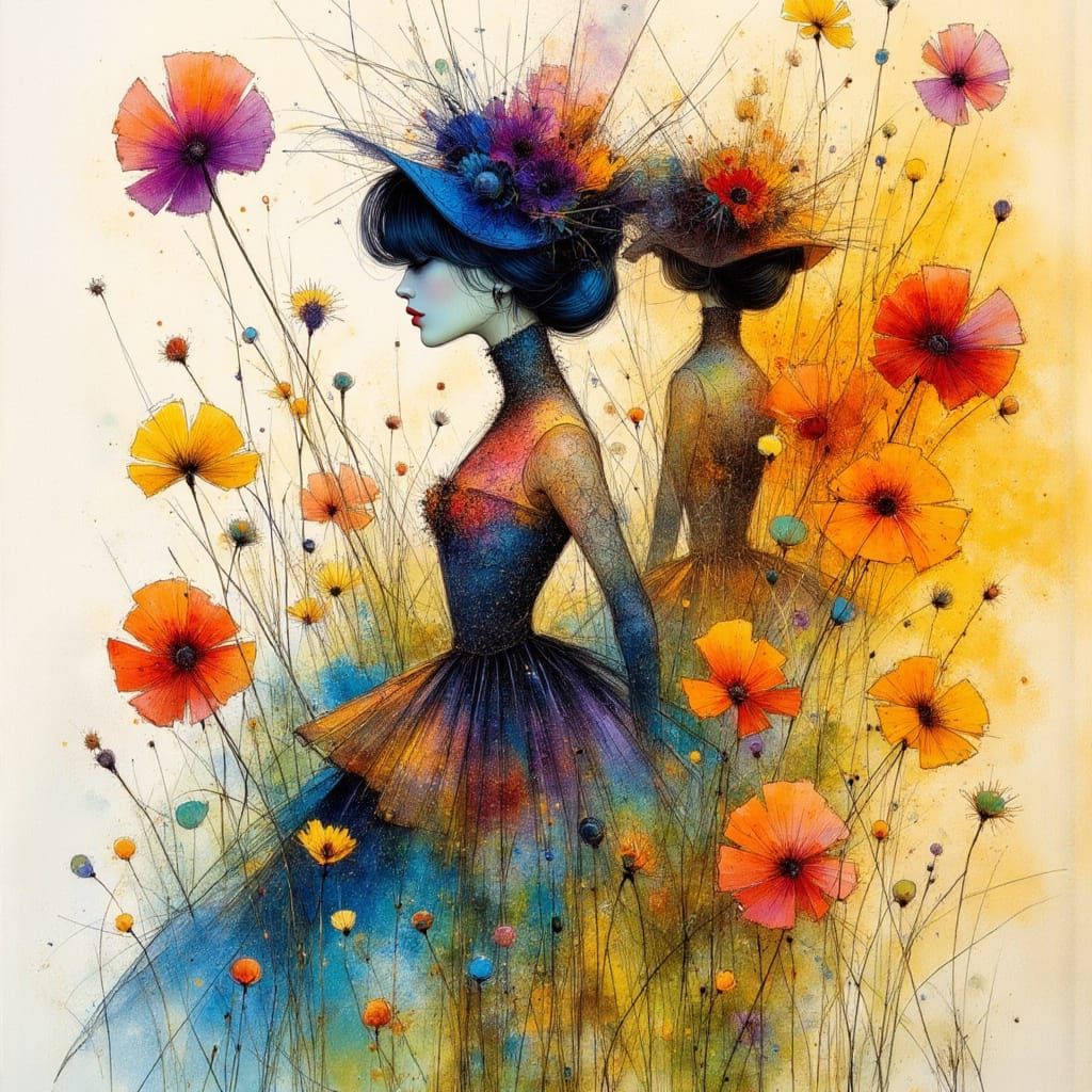 A vibrant and detailed watercolor painting with surreal and whimsical elements. The artwork evokes emotional depth with a blend of art nouveau and punk aesthetics.