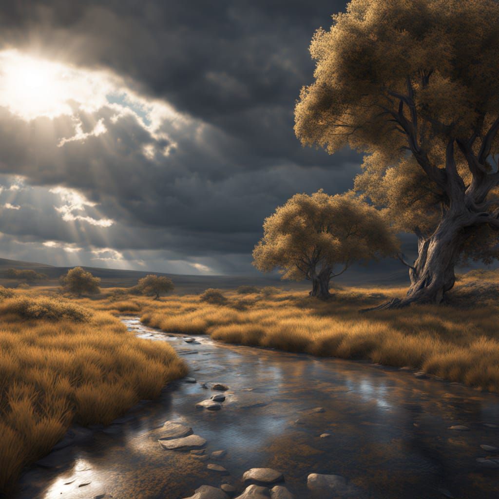 This hyper-realistic digital art shows a surreal landscape divided between a stormy, rain-lashed side and a bright, sunny serene side. Dramatic lighting highlights the contrast.