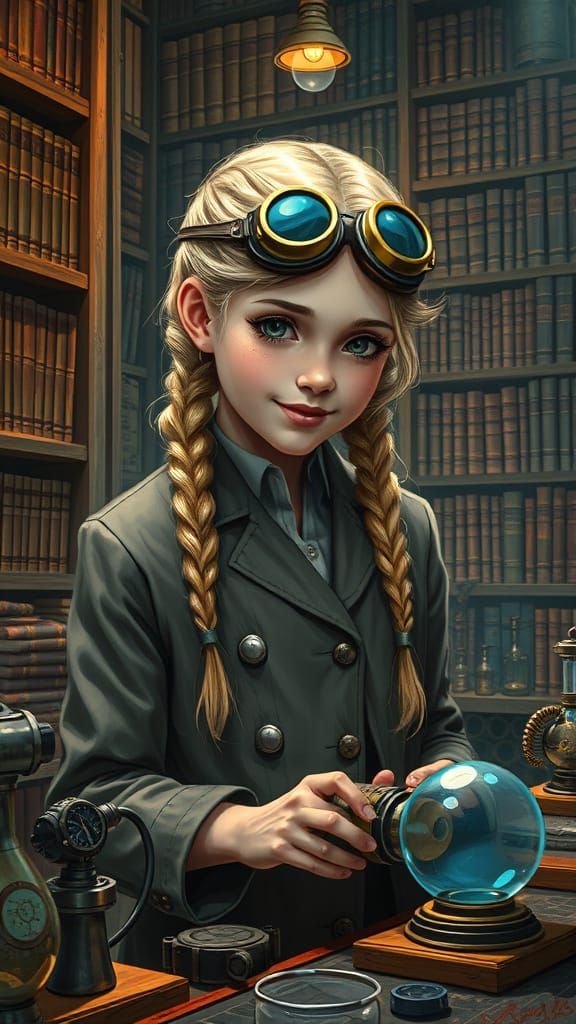 A captivating image of a blonde girl scientist in a steampunk laboratory. She is engrossed in her inventions amid shelves of books, rendered with dramatic lighting and vibrant colors in a hyperrealistic style.