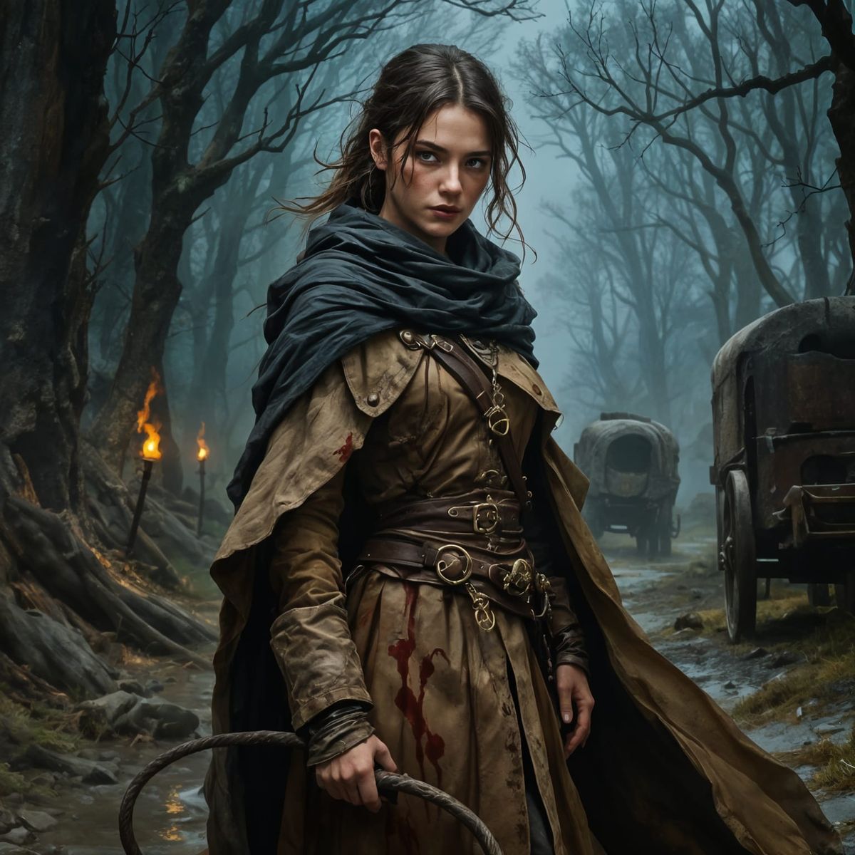 A young woman stands tall in a dark, misty Warhammer Fantasy world, her rugged coat and coiled whip at the ready as she faces unseen threats in the shadows.