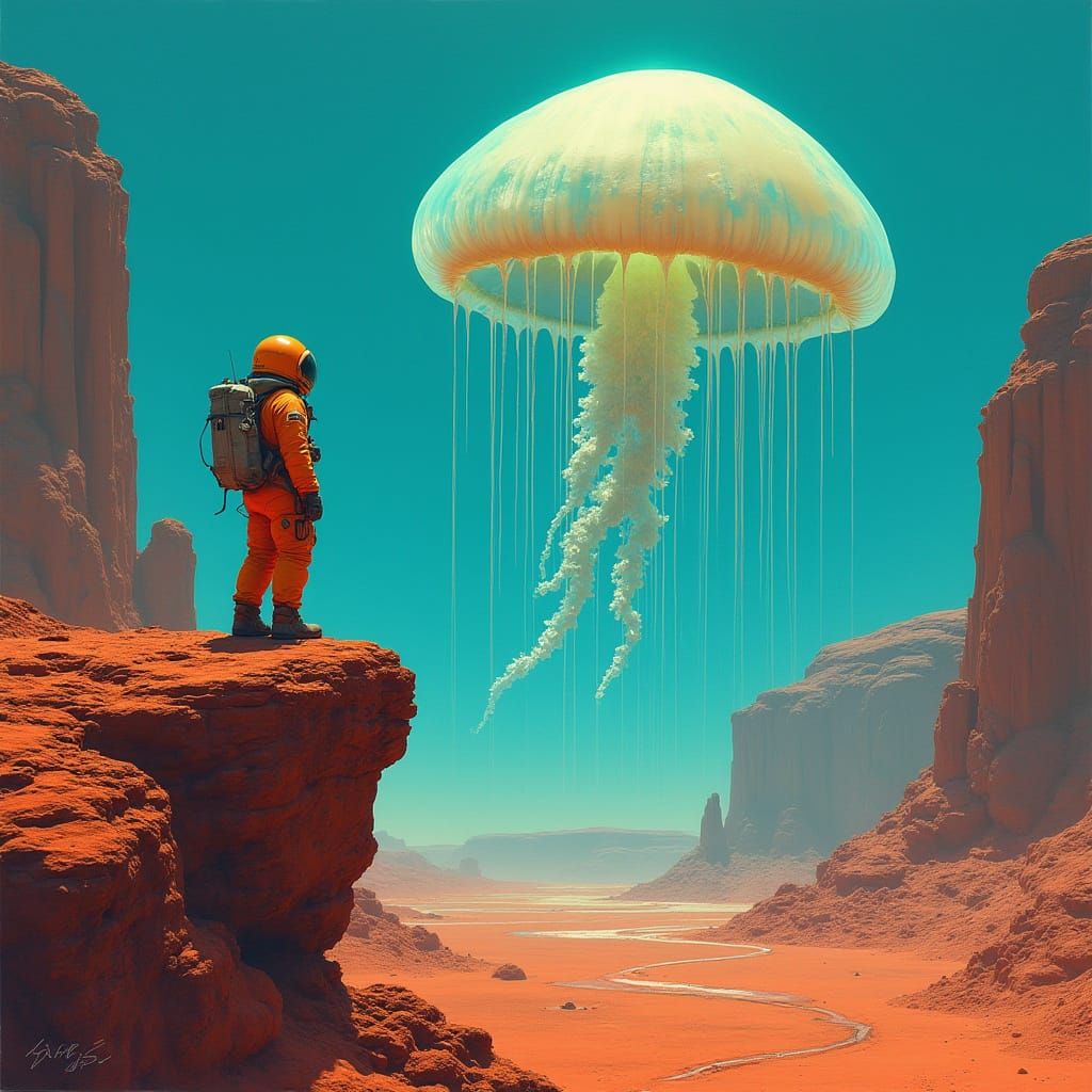 This image depicts a lone astronaut gazing up at a massive, glowing jellyfish in the Martian sky, surrounded by rugged terrain and eerie, crepuscular light, rendered in a dynamic, expressive splatter technique with cosmic surrealism