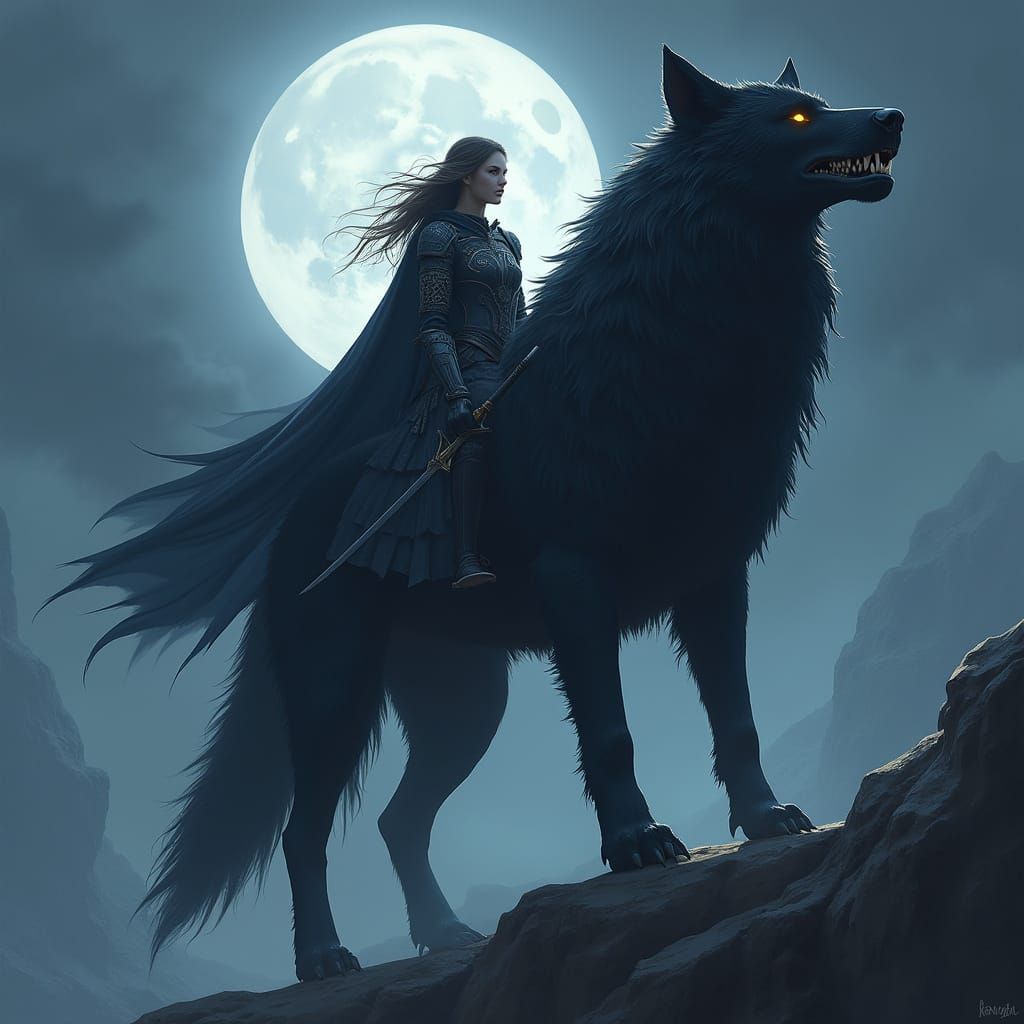 This image shows a majestic black direwolf with glowing eyes standing on a cliff, bearing a brave princess in armor. The artwork features dramatic shadows and cinematic lighting reminiscent of epic fantasy art.
