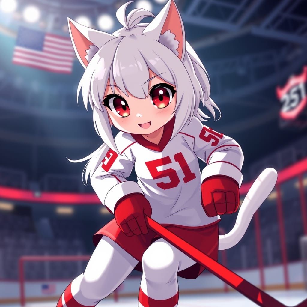 This image shows a cute anime catgirl playing hockey with her big red eyes shining brightly under moody lighting in a hockey arena, showcasing her adorable and energetic personality.