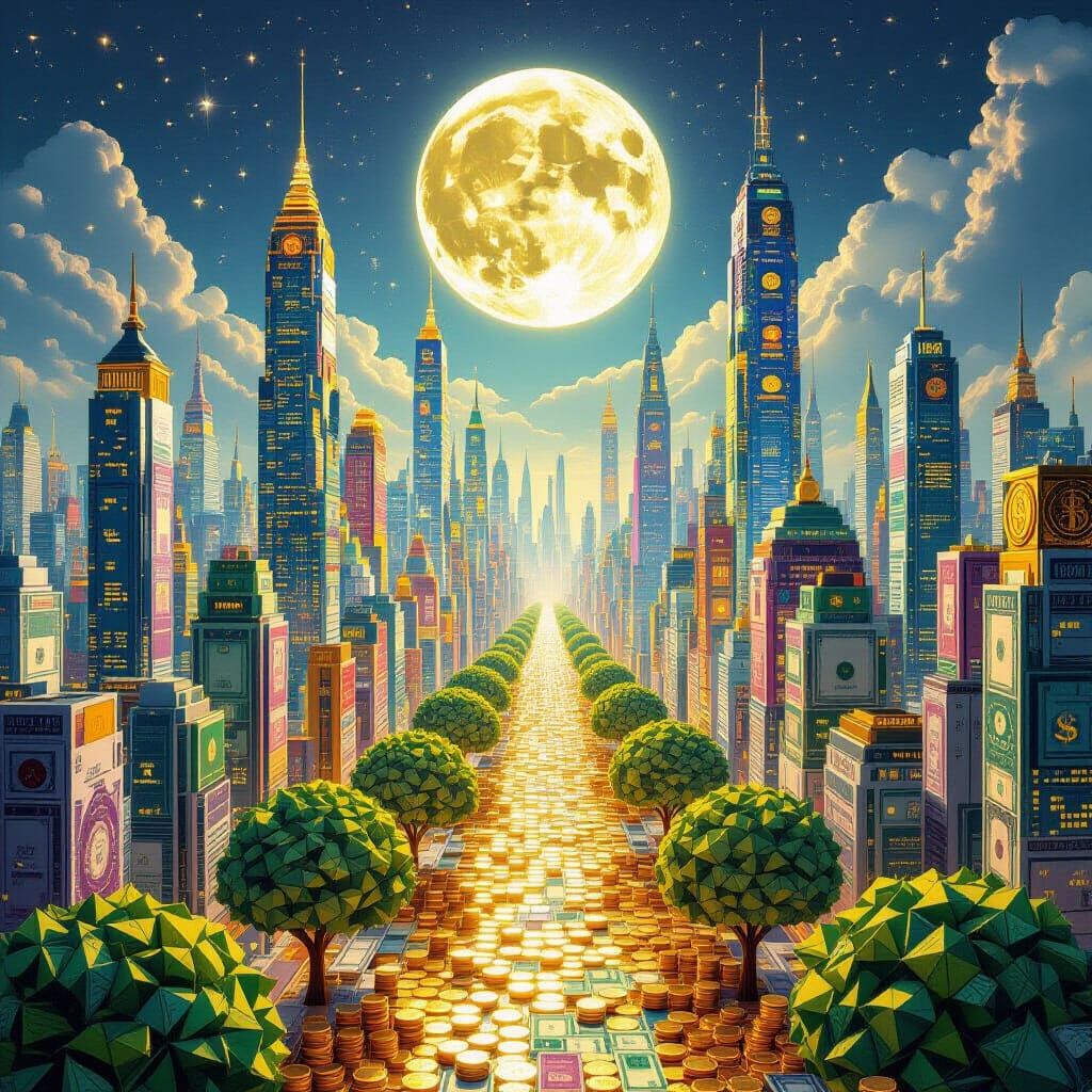 This image depicts a futuristic metropolis constructed from global banknotes and golden coins. Skyscrapers rise high, with trees featuring origami leaves made from bills, all under a luminous coin-shaped moon.