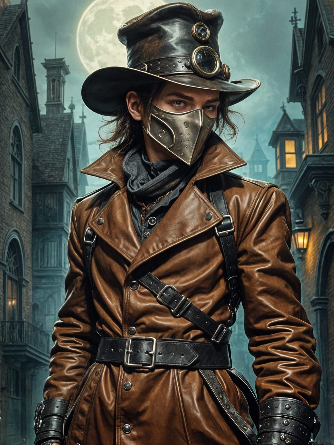 This image shows a steampunk-style plague doctor in a leather duster coat with buckles, set against a gothic Victorian backdrop. The artwork is reminiscent of mixed media pin-up art.