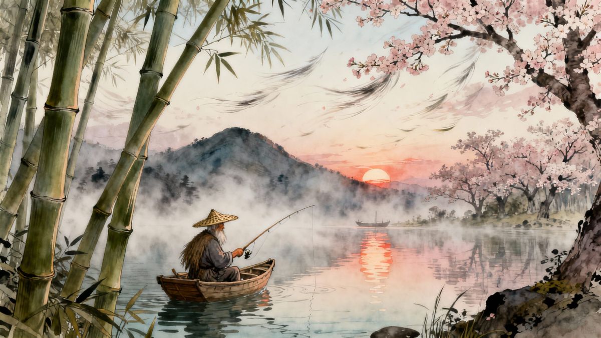 This image captures a serene mountain lake at sunset, viewed through bamboo stalks. An old man fishes from a boat, with reflections and cherry blossoms adding to the pastel, misty atmosphere.
