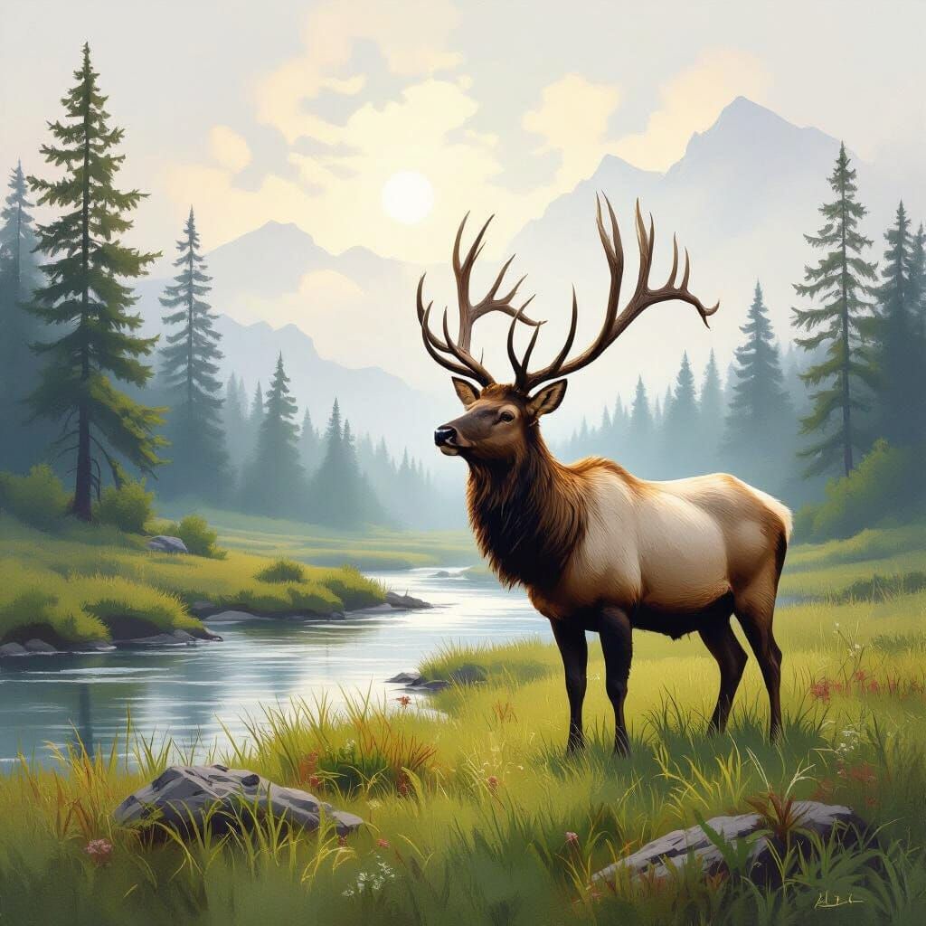 This image shows a majestic elk with a misty aura in a peaceful meadow near a river. The artwork employs landscape realism and atmospheric techniques.