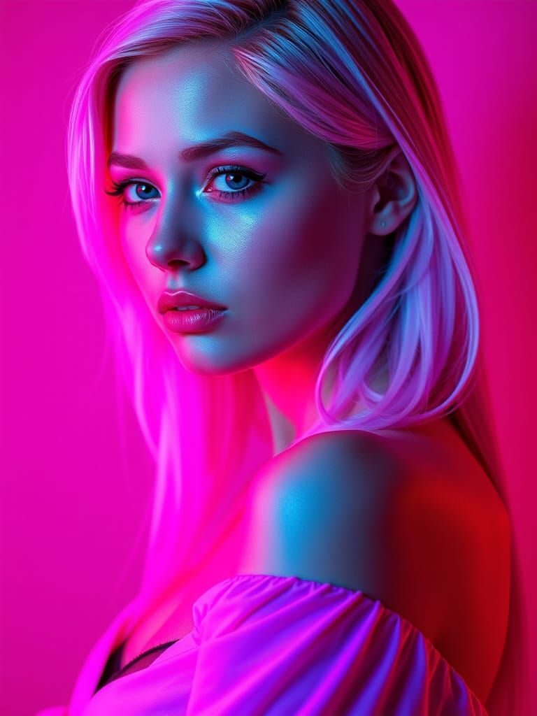 This vibrant image depicts a young redhead woman with a bold, daring pose, showcasing her curves and captivating gaze. Created in a hyper-realistic graffiti style, with neon tones and intricate details, evoking the works of conceptual art masters.