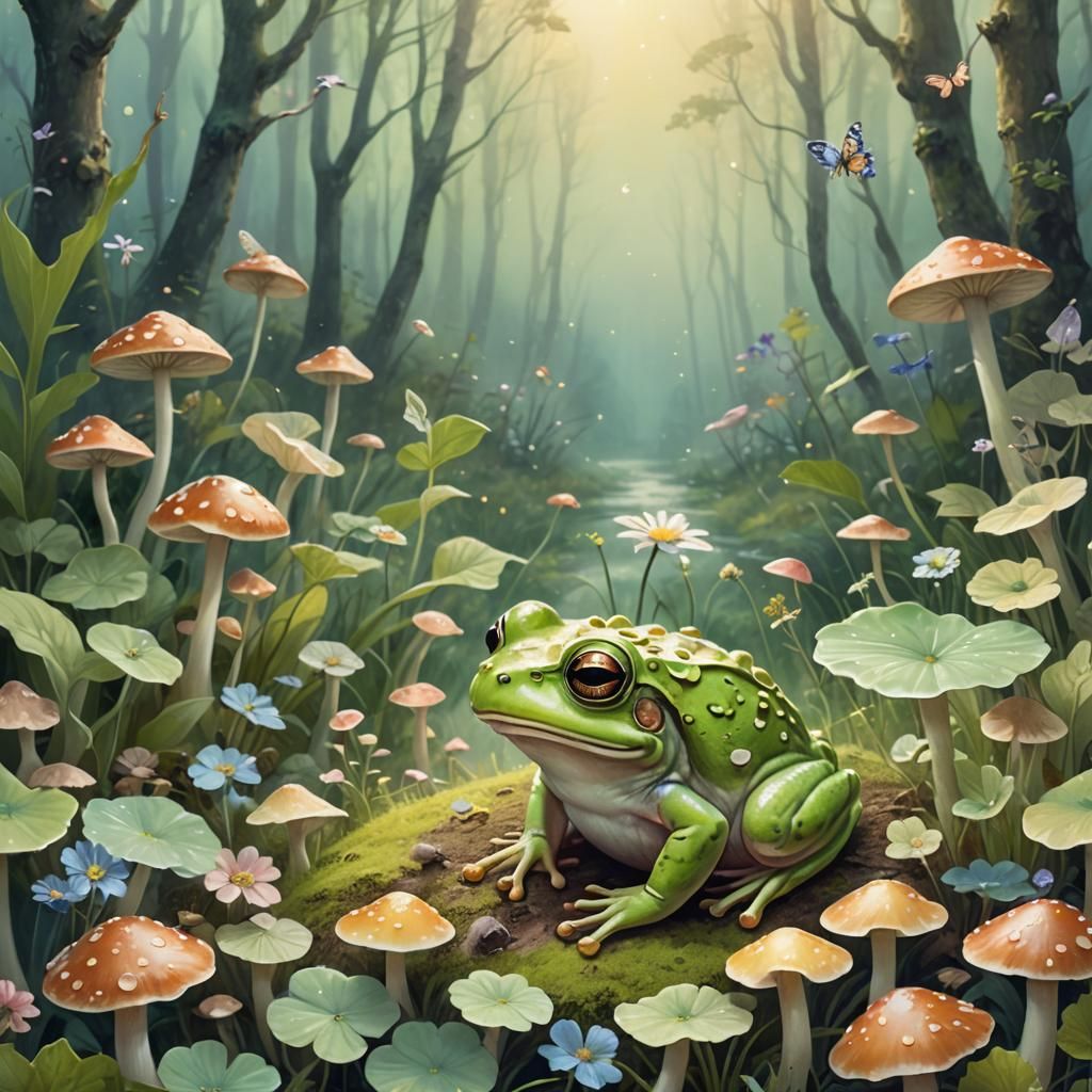 A close-up whimsical illustration of a cute green frog with fairy wings and a flower on its head, in a warm forest of small mushrooms. The image has the soft, luminous, pastel colors of French Impressionism.