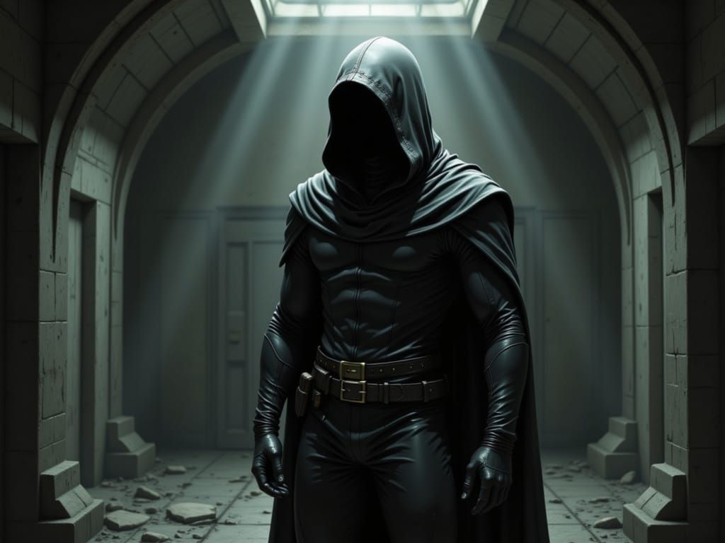 A comic book image of a dark, hooded figure named Oblivion in a dilapidated fallout shelter. The scene evokes existential dread through twisted shadows and muted colors, in a style reminiscent of surrealist horror art.