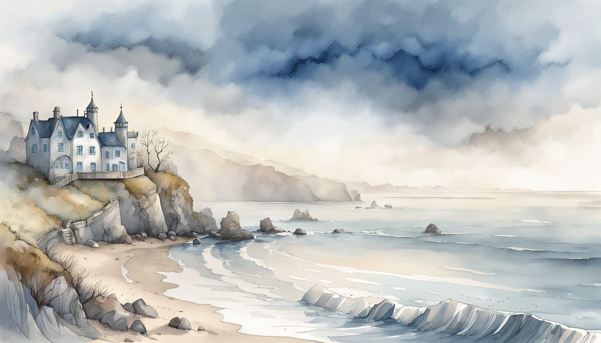 This image captures a mysterious misty morning by the sea, rendered as a detailed pen and ink sketch with watercolor washes. It evokes an ethereal and dreamlike atmosphere with soft blue and grey gradients.