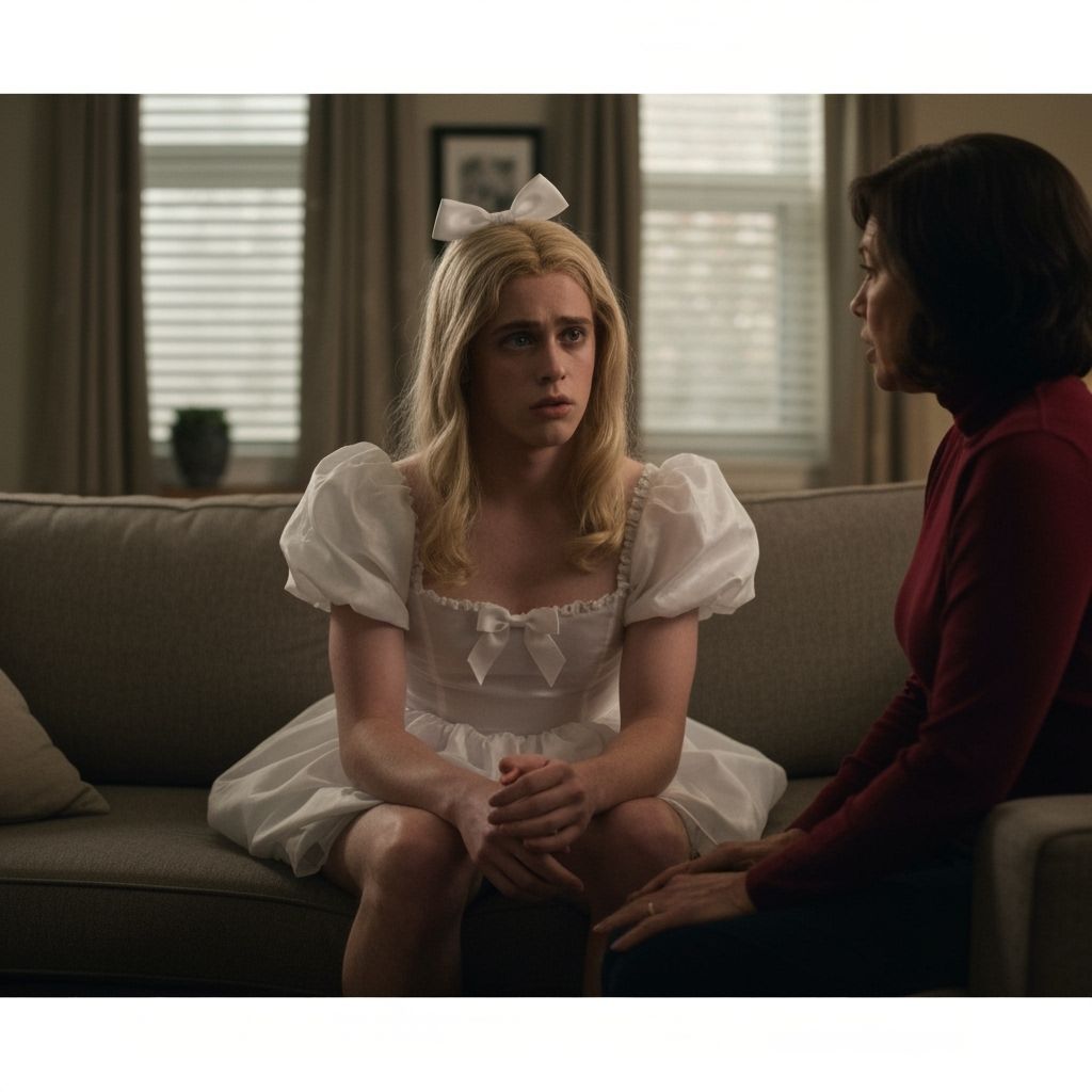 A cinematic film still captures a worried young man in a minidress sitting on a couch while his mother speaks seriously. Features dramatic lighting and film grain.