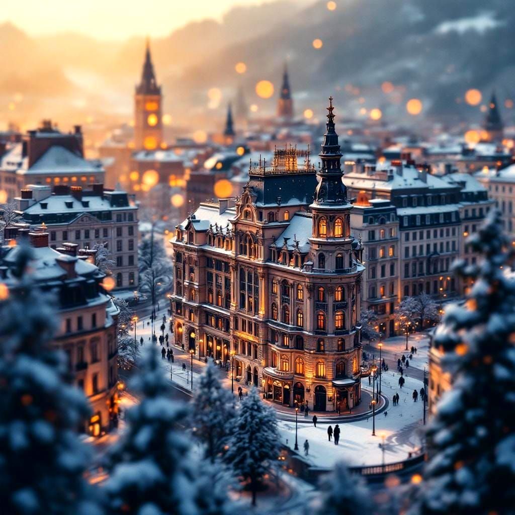 A stunning miniature photograph captures Lyon's Belle Epoque architecture in a snowy, golden afternoon. Features extreme bokeh and a misty, magical atmosphere.