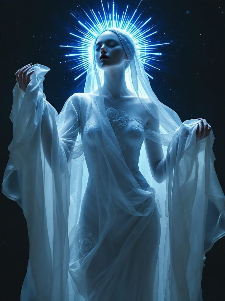 A glowing feminine figure in a white dress stands in a dark, abstract space. The image showcases surreal, symbolic portraiture with religious undertones, rendered with hyperreal form and an ethereal glow.