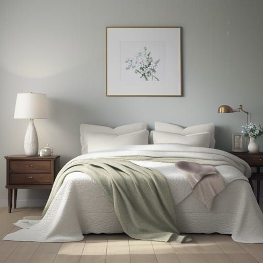 This photorealistic digital art showcases a bedroom with floral wall art above a bed, illuminated by a glowing bedside lamp. Features pastel decor, plush blanket, and realistic textures.
