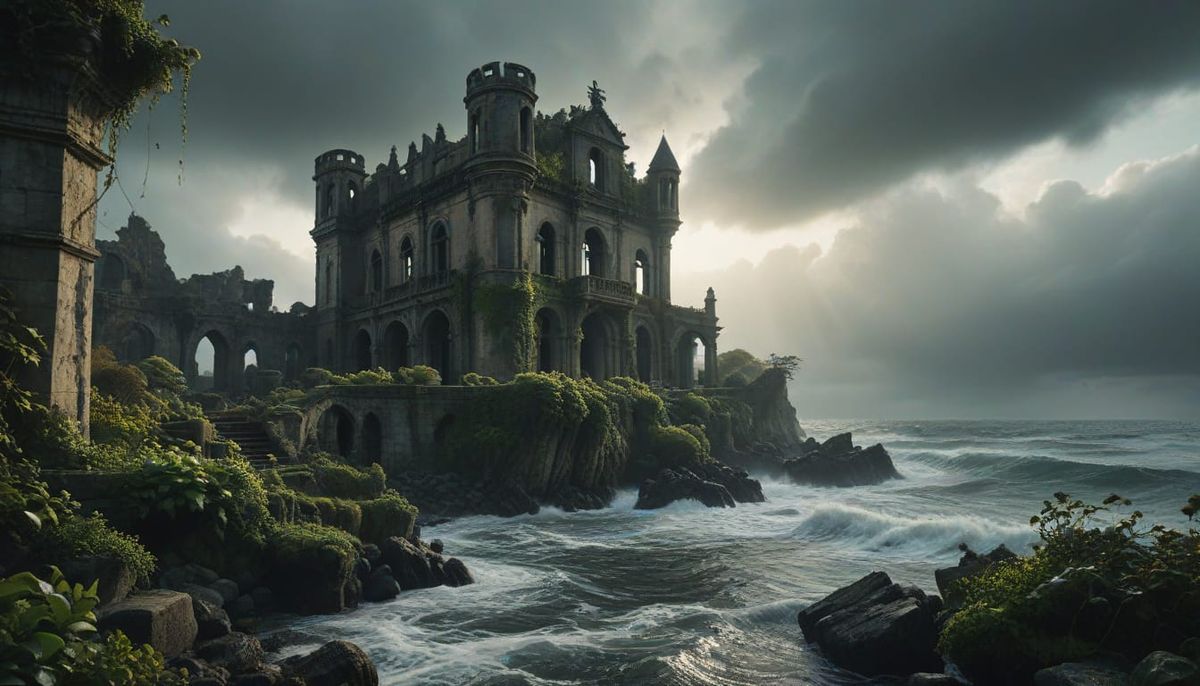 This haunting image captures a ruined gothic and baroque chateau on the edge of a turbulent sea, with intricate details and cinematic lighting. The crumbling structure is surrounded by overgrown gardens and a partially submerged courtyard, while waves crash against the rocks in the background.