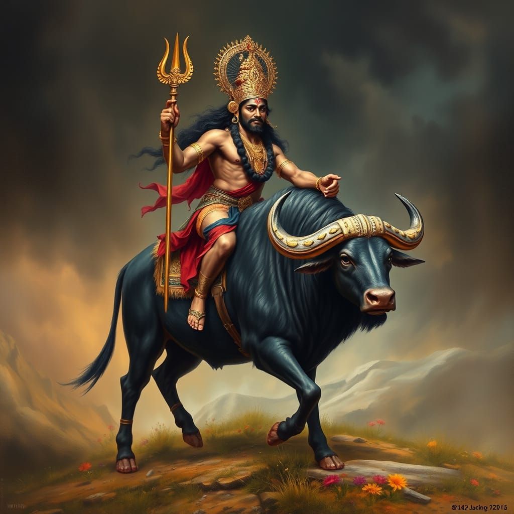 This image shows Yama, the Hindu god of death, riding his buffalo. The artwork is rendered as a realistic oil painting with dramatic lighting and fine detail.