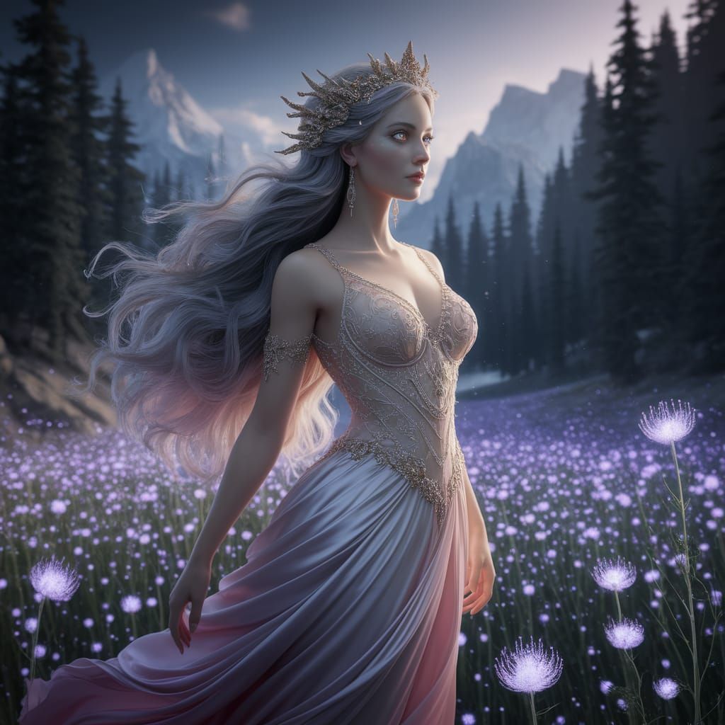 A striking picture of a goddess in a flowing silk gown, standing in a field of bioluminescent flowers. The image features dynamic lighting and intricate details, with an airbrushed Art Nouveau aesthetic.