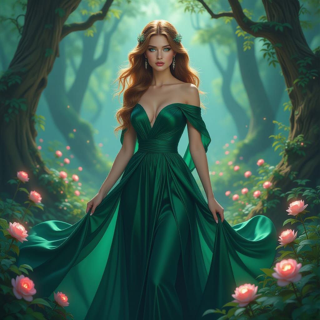 A striking picture of a young woman with rose gold hair in a glowing forest. She wears a flowing emerald gown with bioluminescent patterns in an art nouveau style.
