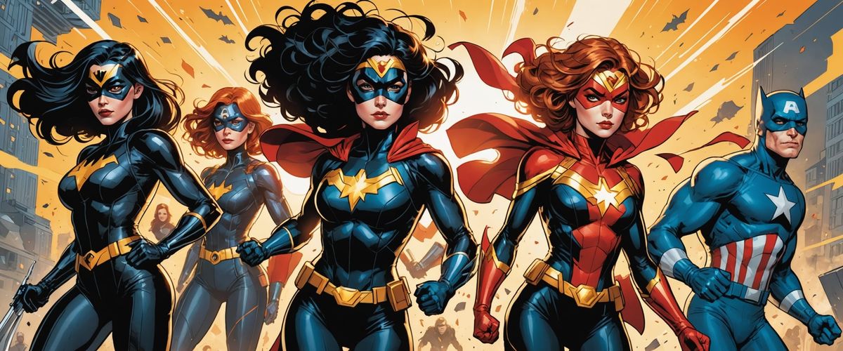 A vibrant image showcasing comic book superheroes and heroines in striking black costumes. The artwork captures a dynamic group in gouache and watercolor style comic book art.