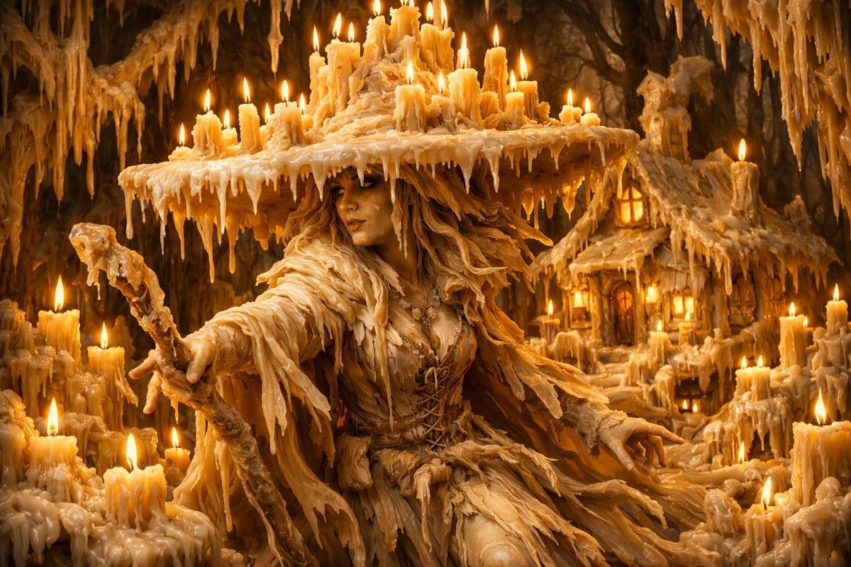 This image showcases a surreal woodland witch crafted entirely from wax, wearing a wide hat adorned with burning candles and dripping wax. The scene features a melting wax forest and cottage under dramatic lighting.