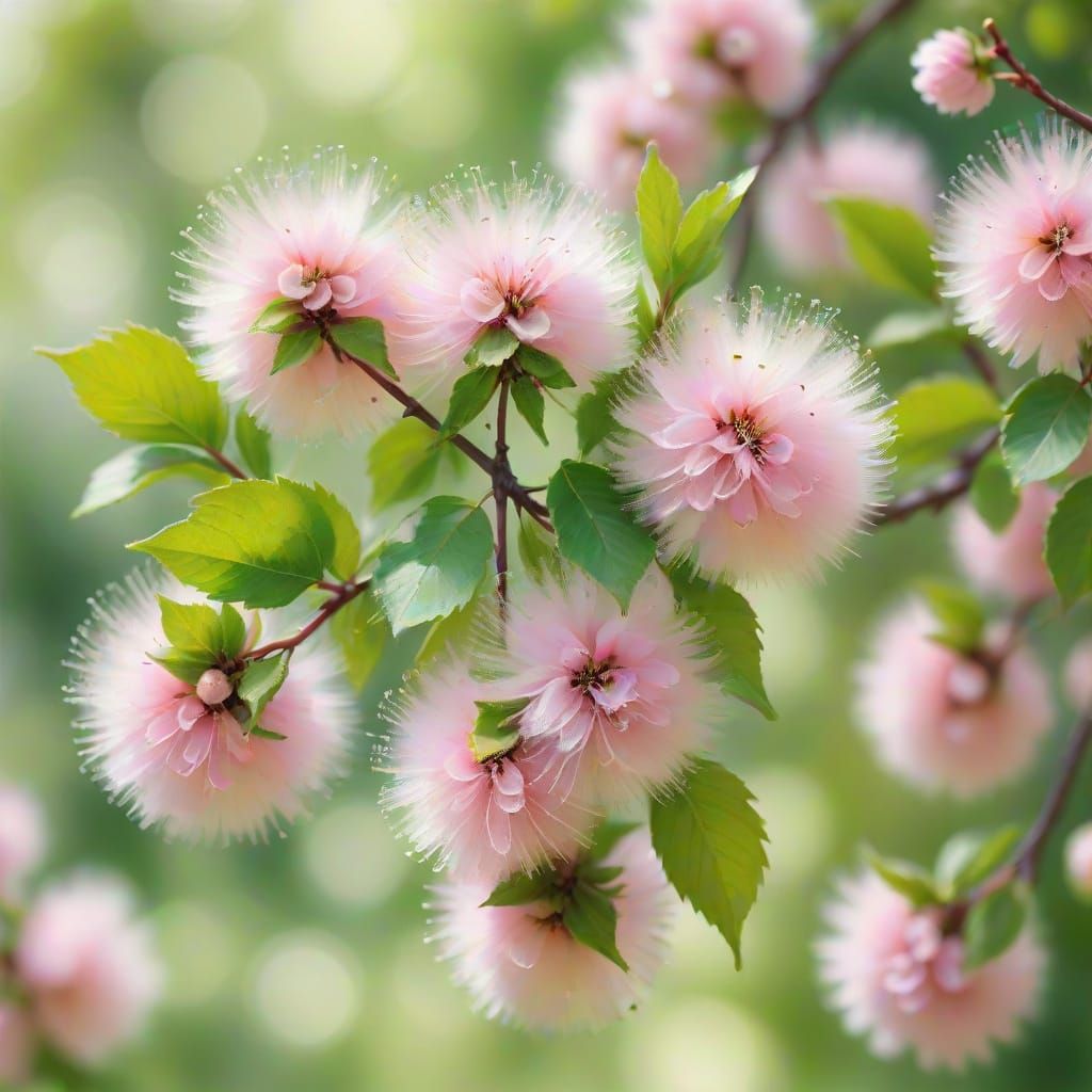 A close-up of a green branch with blossoms made of fluffy pink pom poms, reminiscent of Impressionist paintings. The image features soft brushstrokes, vibrant colors, and a shallow depth of field.