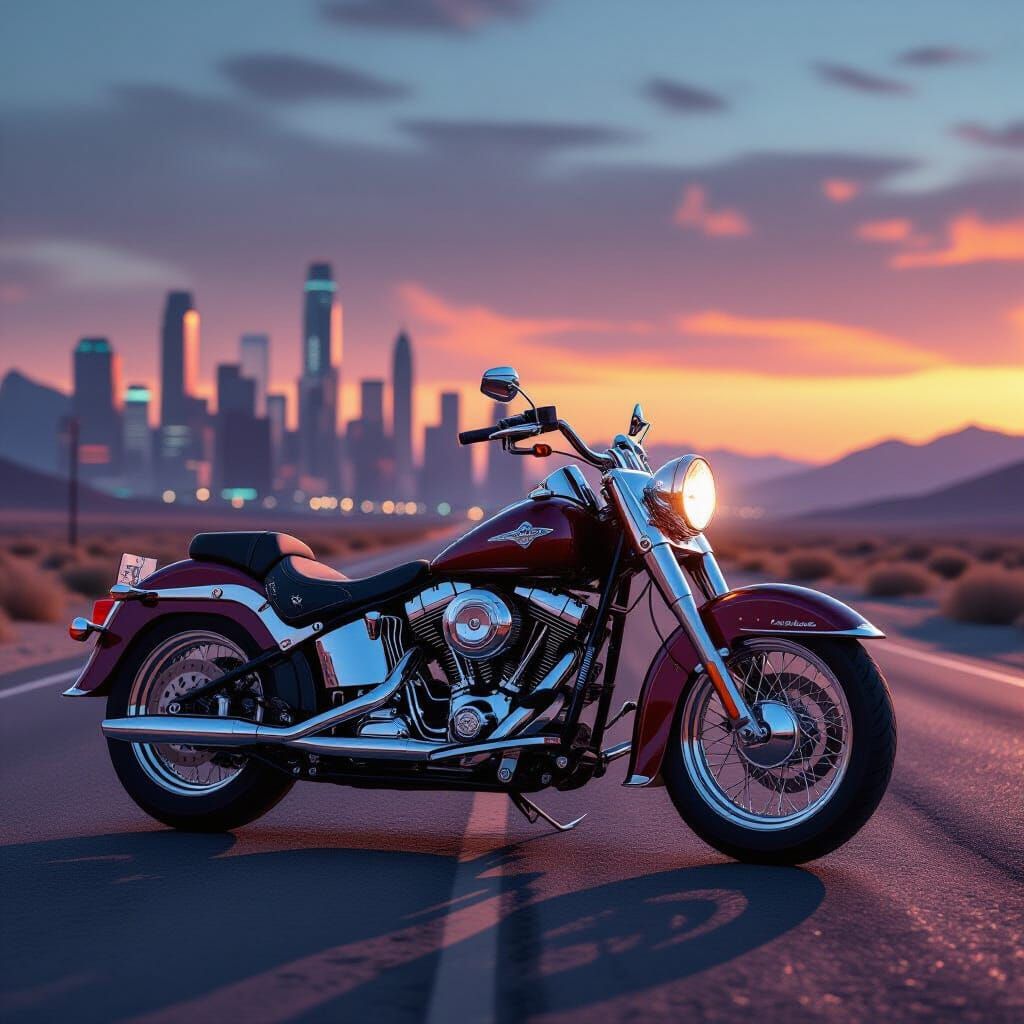 This image shows a detailed vintage motorcycle on a dusty highway leading to a cyberpunk city at dusk. Photorealistic style with sleek lines and gritty realism.