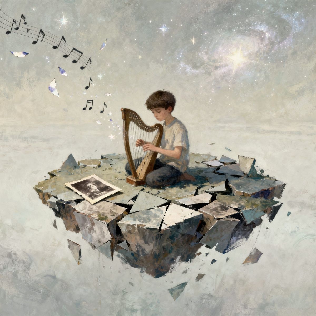This image depicts a surreal, fragmented island adrift in space, composed of memory fragments. A boy plays a harp, with musical notes and celestial light swirling around him, evoking introspection and loss.