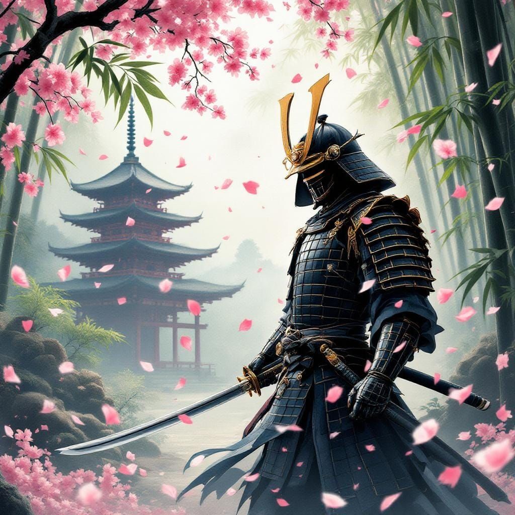 This image shows a samurai warrior in ornate black and gold armor, holding a katana. Cherry blossom petals fall around him, with a temple and pagoda visible in the background. The image is reminiscent of traditional Japanese ink wash painting.