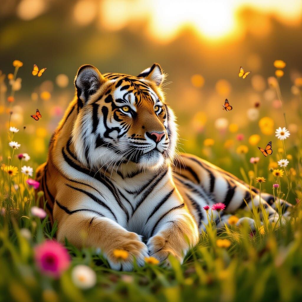 A hyperrealistic image of a Bengal tiger resting in a flower-filled meadow, bathed in golden sunlight. Butterflies flutter around the tiger in this image with vibrant colors and meticulous detail.