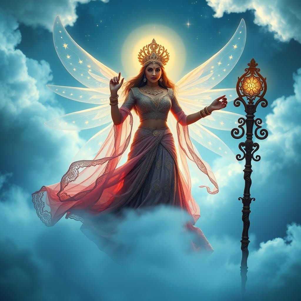 Indo-gothic Concept Art. Medium shot. painting of a spirit of divinity, descending from the sky, intricate long flowing Indian lehenga, hyperdetailed by yoshitaka amano and Ekaterina Savic, Indian fantasy art, celestial, ethereal, digital illustration, volumetric lighting Divine lacey classy Indo-gothic ...