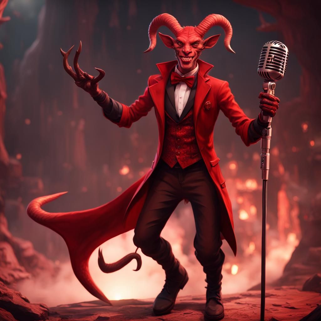 This image shows a red-skinned Tiefling character in a red suit and black bow tie, holding a microphone. The devilish figure has short antlers and a wide grin in a detailed fantasy concept art style.