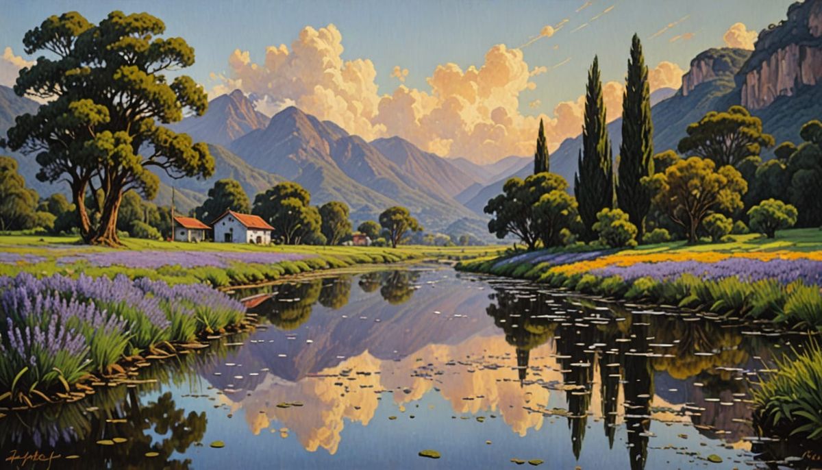 Esta obra de arte apresenta uma cena tranquila e pitoresca ambiente à noite ou no início da manhã, com um moinho de vento, um corpo de águ...