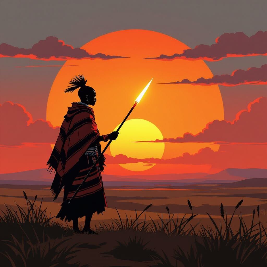 A lone Maasai warrior stands silhouetted against a dramatic sunset on a battlefield, holding a glowing spear. The art features bold lines and high contrast, inspired by vibrant, atmospheric graphic styles.