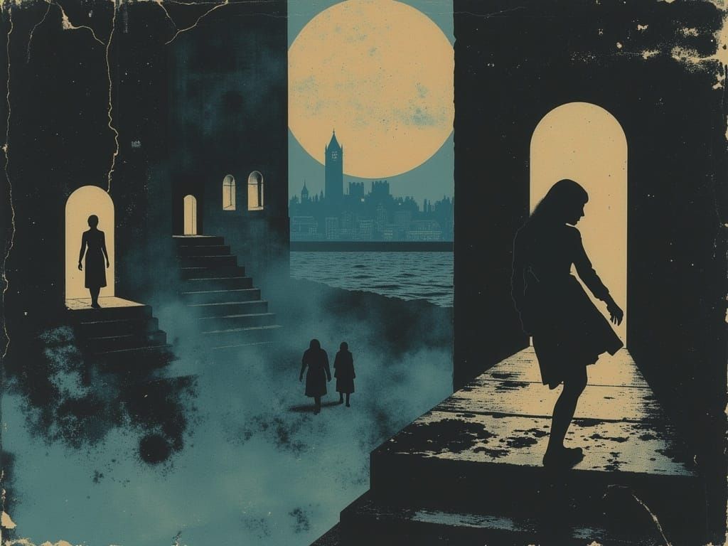 A figure dances on a surreal stairway to nowhere beneath a starry sky. This image evokes a dreamlike and uneasy atmosphere with silhouetted figures and a dystopian cityscape in neo-gothic style.
