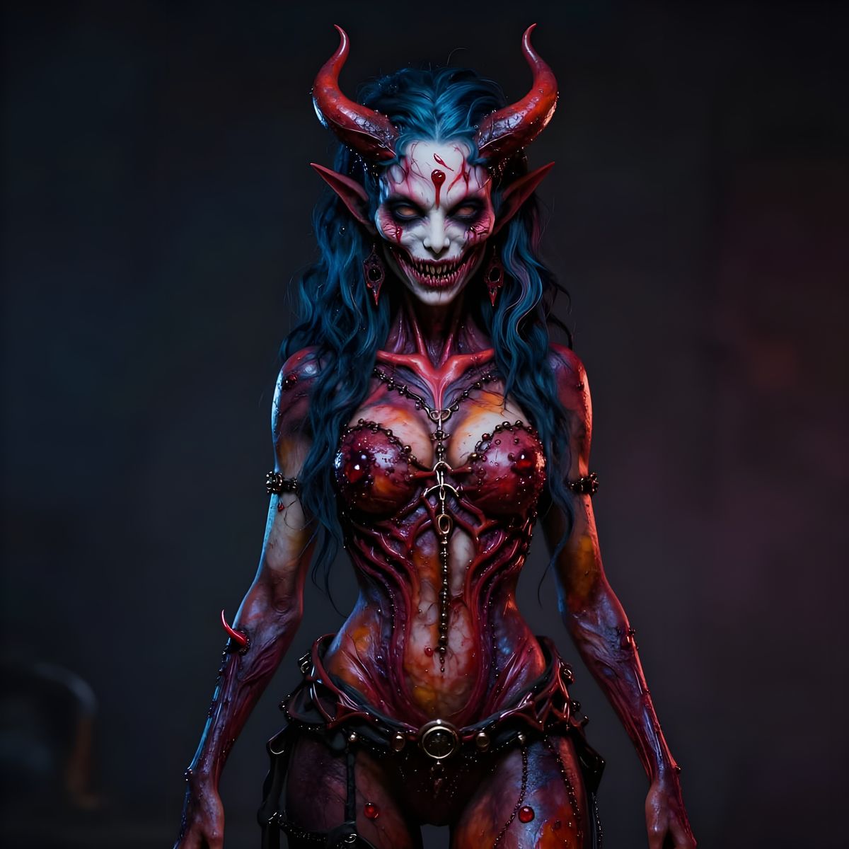 This image showcases a full body portrait of a demon girl with vibrant skin and a highly detailed face, emphasizing horror and monstrous elements with dramatic lighting.