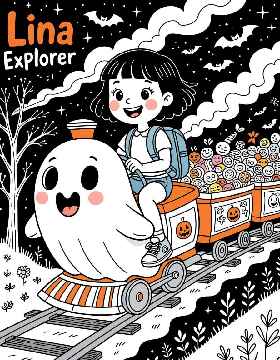 This image shows Lina the Explorer, a happy girl with a bob haircut, riding a colorful Halloween ghost train filled with candy. The art style features clean line art without shading, evoking a children's book illustration.