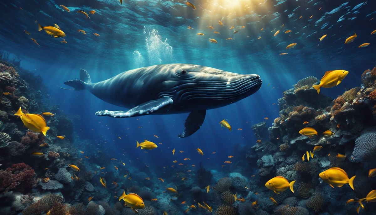 This image shows a giant whale swimming past a small submarine in the deep ocean. Bioluminescent fish surround them in this cinematic, ultra-realistic underwater photograph.