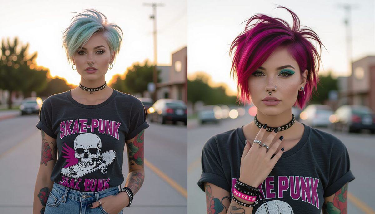 This image shows a punk girl embodying skate-punk aesthetics. She sports an asymmetrical hairstyle with vibrant colors, distressed jeans, and chunky sneakers. The image captures a playful and confident expression with professional photography techniques.