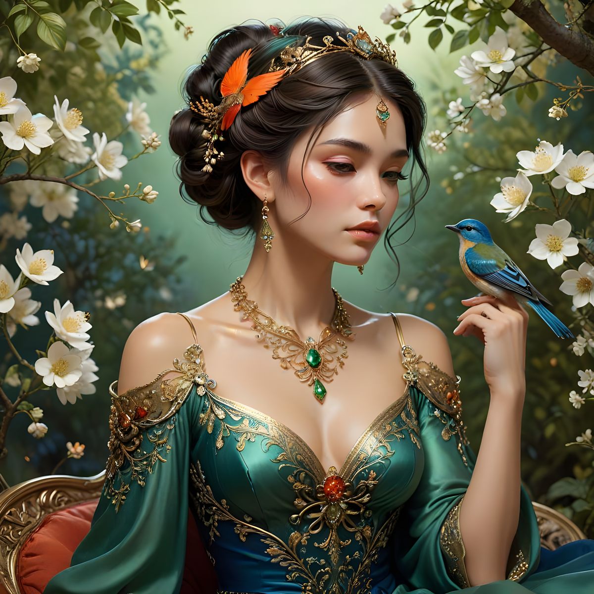 A digital portrait of a woman with an elaborate hairstyle and jewelry. She is sitting among flowering trees with a bird hovering nearby, in a fantasy art style.