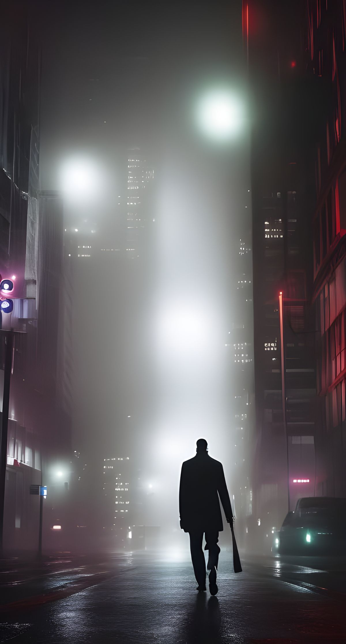 This image shows a solitary figure walking through a foggy noir cityscape. The artwork features luminescent surreal elements and bold, contrasting colors in an abstract expressionist style.